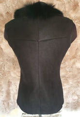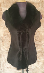 Rövid karcsúsított szabású, elöl kötős megoldással záródó, galléros női mellény.