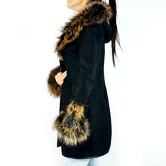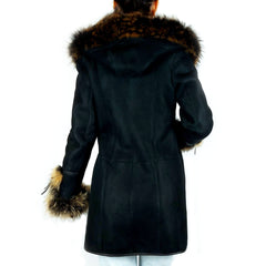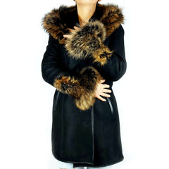 Középhosszú, karcsúsított, kissé Á vonalú fazon. Elől gombos záródású, kapucnin és ujjai végén coyote prémmel díszített női irha kabát.