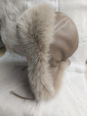 Egyedi megjelenésű, báránybőrből készült, rókaprémmel díszített usánka.