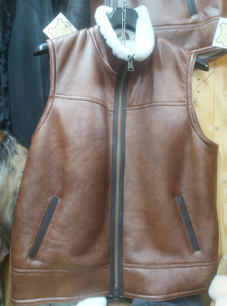 Fenék közepéig érő, elől czipzáras záródású, galléros férfi irha mellény .