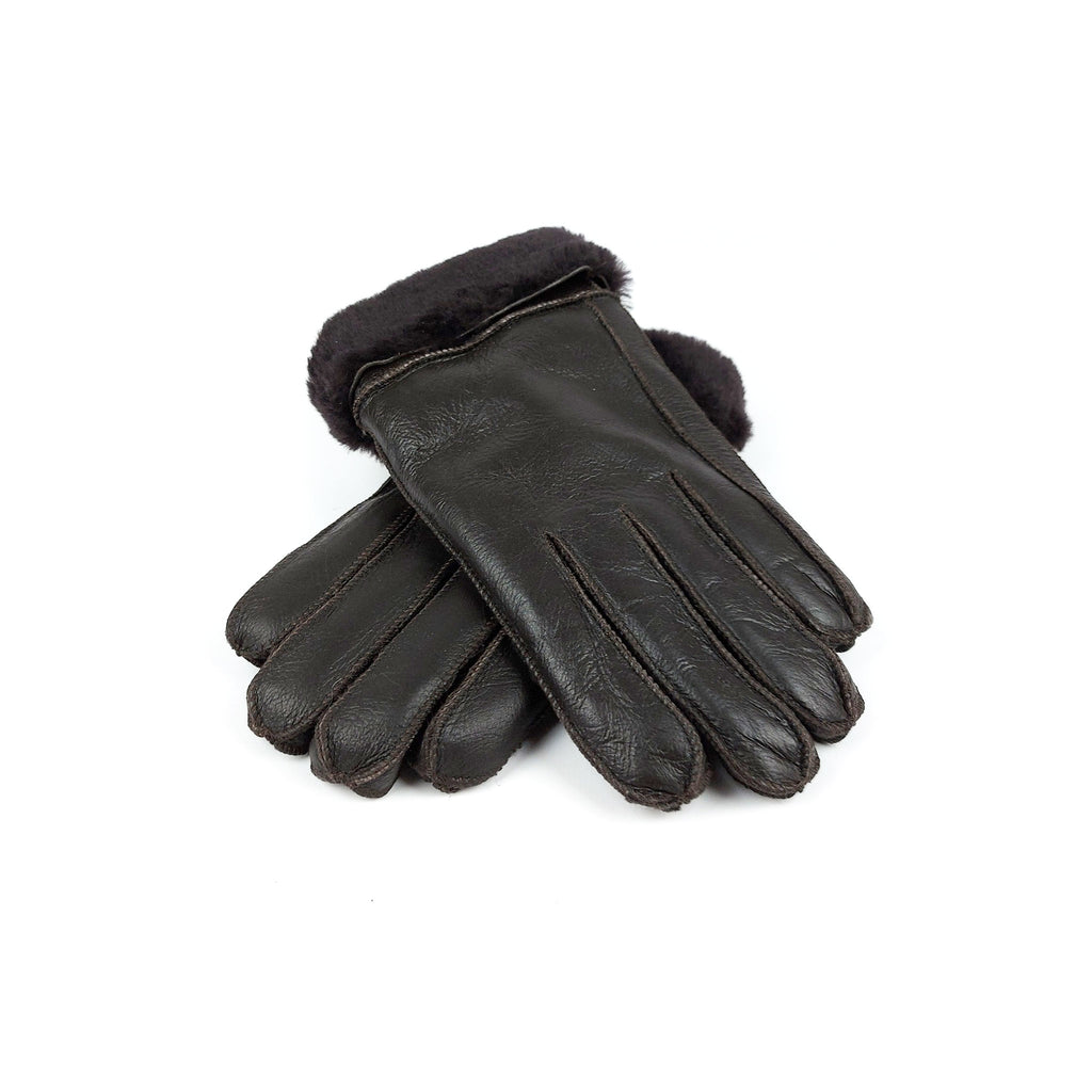 Ötujjas, nappásított, kézműves, sötétbarna színű női irha kesztyű