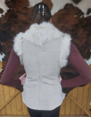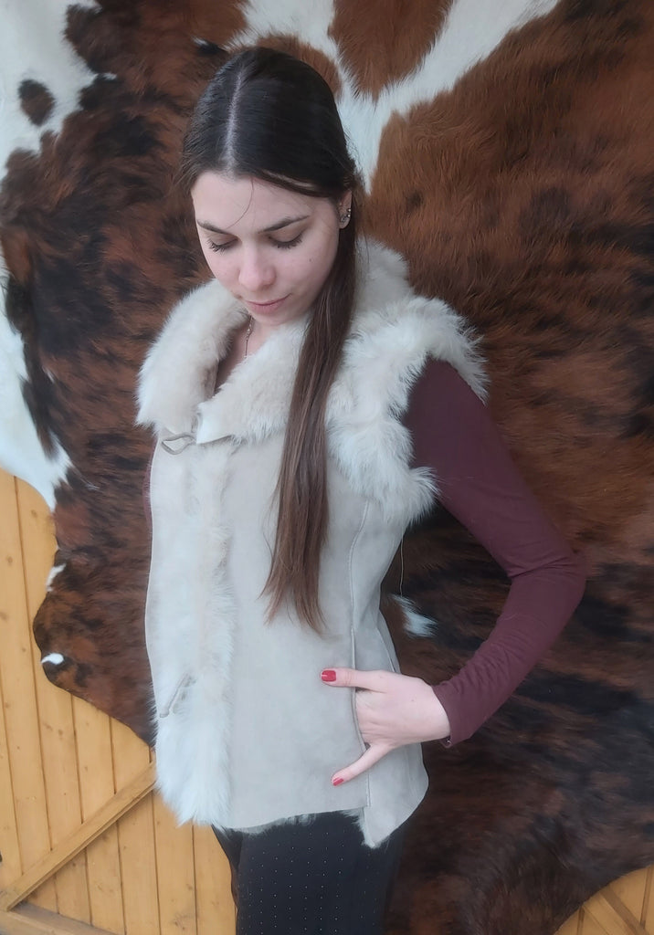 Rövid karcsúsított szabású, elöl kötős megoldással záródó, galléros női mellény.