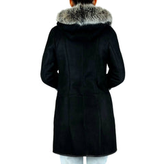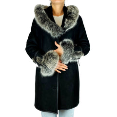 Középhosszú, karcsúsított, kissé Á vonalú fazon. Elől gombos zárodású, kapucnin és ujjai végén ezüstrókaprémmel díszített női irha kabát.