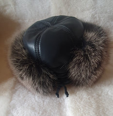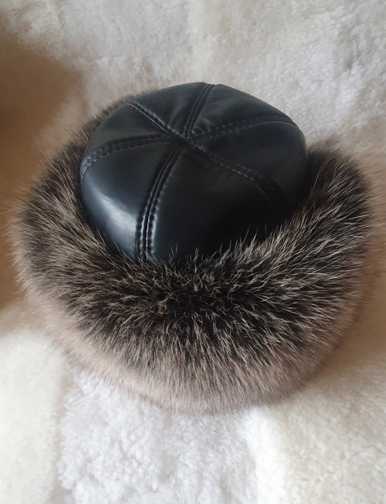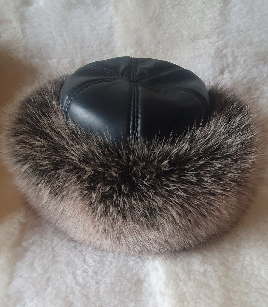Egyedi megjelenésű, báránybőrből készült, rókaprémmel díszített női sapka.