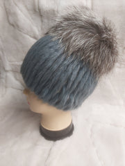 Szőrméből készült, világoskék színű rókabojttal díszített, női szőrme sapka.